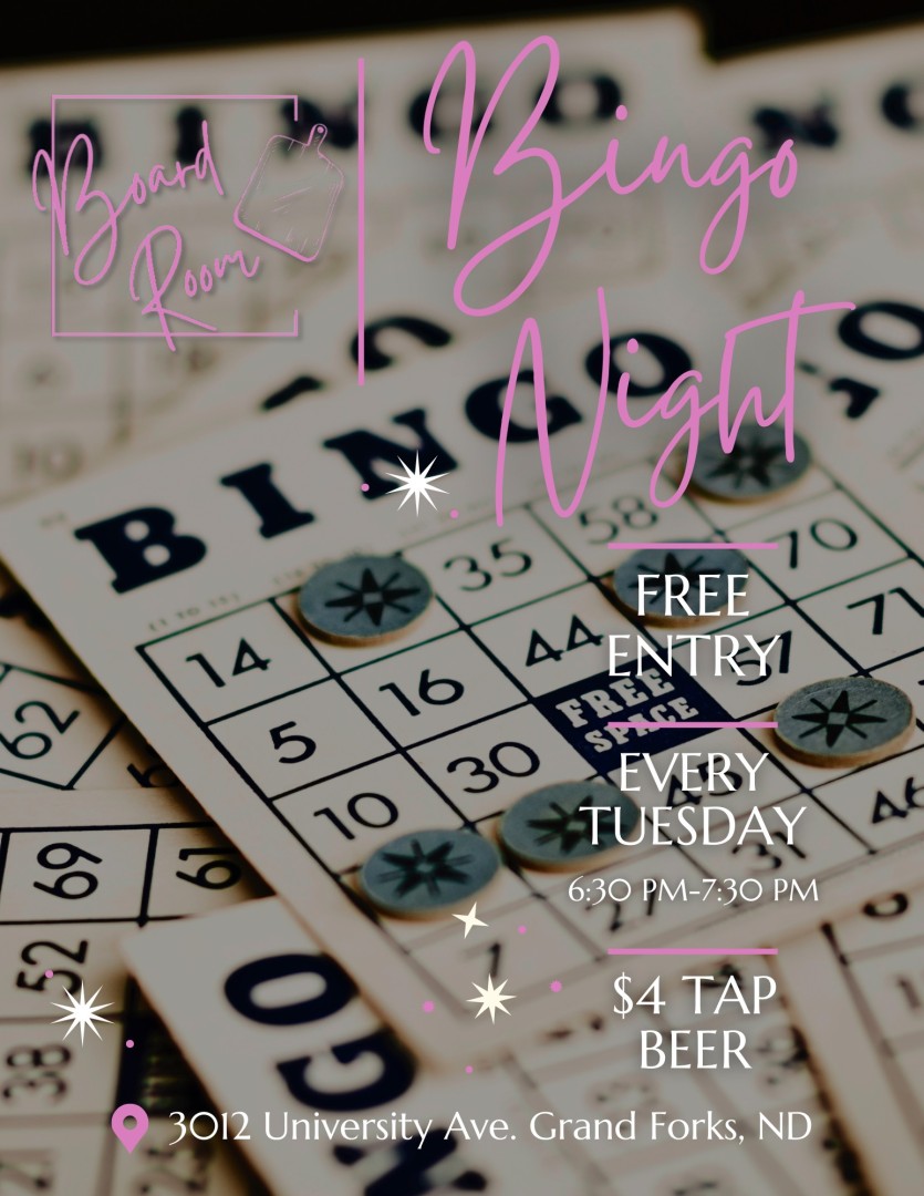 Stop by the Board Room UND campus location and get ready to daub your way to BIG BINGO victory every Tuesday night! 18+ event, just purchase a drink and receive your bingo card!