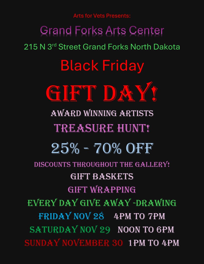 Join us at Arts for Vets for our annual Black Friday Event! This year we are doing 3 days of deals, 25%-70% off!!! There will be gift baskets, gift wrapping and a drawing everyday for a free gift!
