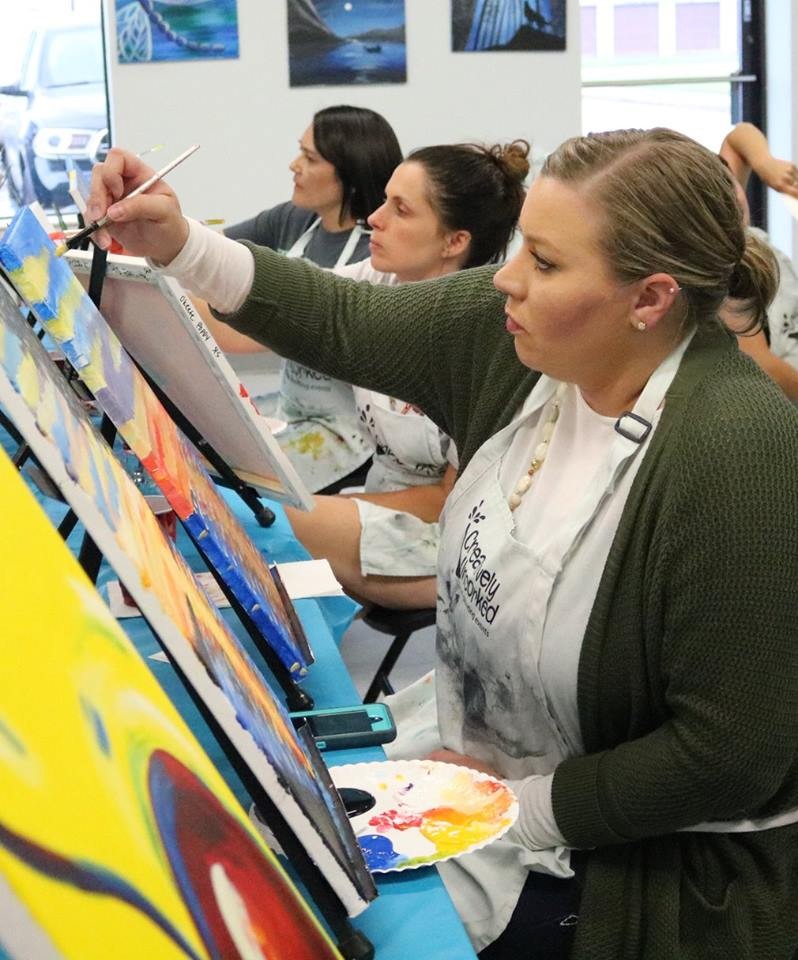 Arrive early to check in, grab a drink, and choose your seat. Aprons are provided, but wear something you don’t mind getting a little paint on. Seating is first‑come, first‑served; groups should have someone arrive early to save spots. Reserve your seat by signing up and paying in advance on our website.