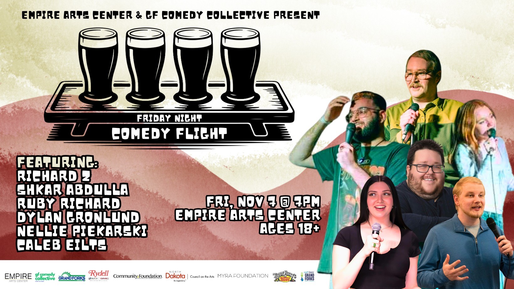 Take off for a night of laughter with the Friday Night Comedy Flight—a tasting menu of standup comedy from some of the region’s best comedians! Just like a flight of beers, each comic brings their own unique flavor, served fresh and ready to make you laugh. Featuring performances by: Richard Z, Shkar Abdulla, Ruby Richards, Dylan Gronlund, Nellie Piekarski, and Caleb Eilts. From witty observations to laugh-out-loud stories, this showcase is the perfect way to kick off your weekend. Recommended for ages 18+.
