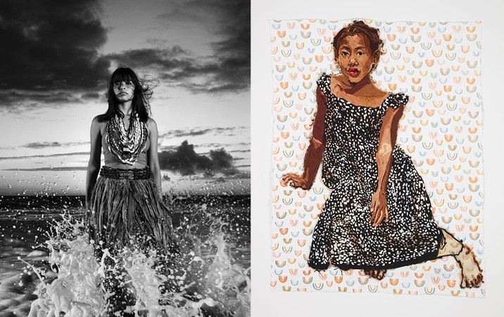 Several works in the exhibition use the lens of the mythical or divine to portray a familiar subject like a family member. Cara Romero’s captivating photograph of her daughter Crickett Tiger, for example, presents her dressed in the regalia of the first peoples of California on a sacred coastal site of the Chemehuevi tribe. Standing in the water with waves crashing at Crickett’s feet, the portrait is a powerful remembrance of the mythos of the tribe’s Great Ocean Woman (Hutsipamamow). Similarly, Beekeeper by Shanna Strauss depicts her grandmother as an enthroned beekeeper, a figure that is revered in Tanzanian culture as a guardian of ancestral memory who shares stories and songs; many stories recount revolutionary women who defied German colonizers. The term “spiritual metadata” has been coined in recent years to describe intangible forms of information that are transferred between generations. Rather than tangible archival evidence, this knowledge is conveyed through color, sound, or vibration. Leonardo Benzant’s colorful abstract totemic figures Afrosupernatural: Entities and Archetypes, for example, do not refer to specific beings or people, rather they conjure magical archetypes broadly based on African spiritual traditions.