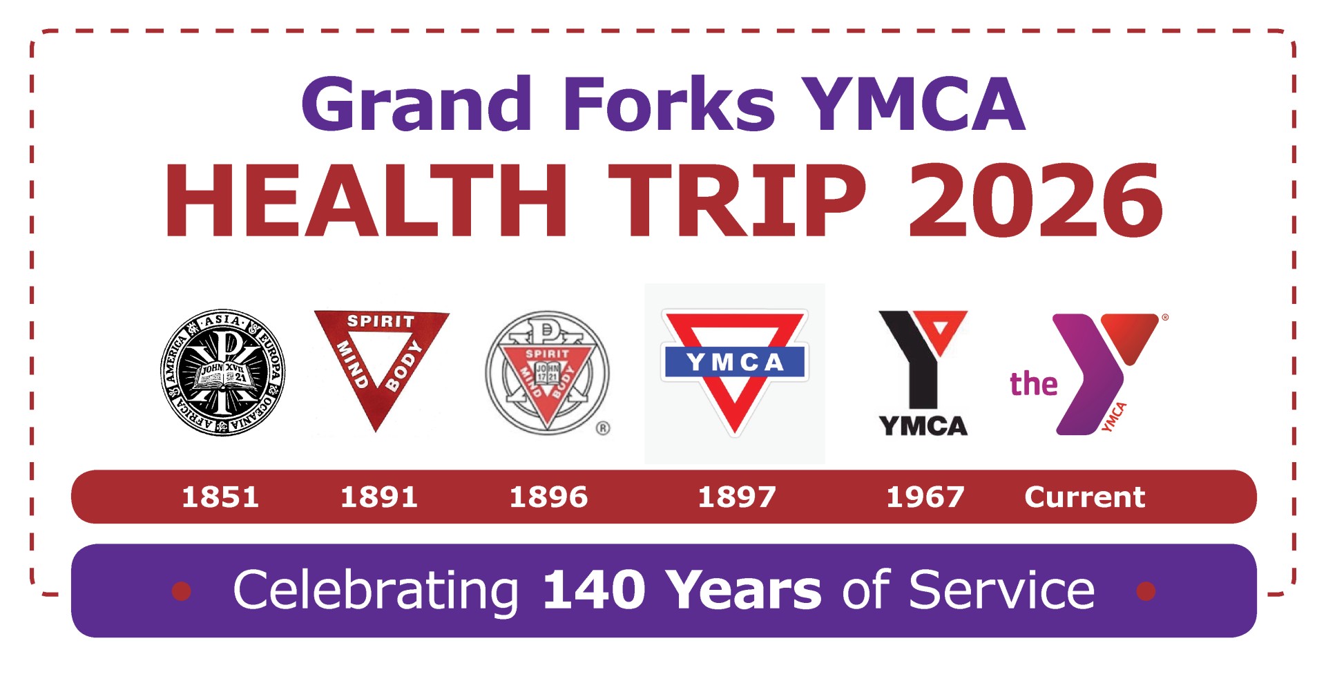 Celebrate the 140 year anniversary of the Grand Forks YMCA by joining Health Trip 2026! This 60-Day incentive wellness program will guide you through the many YMCA milestones from 1886 to the present, while you become healthier, happier and more active.
